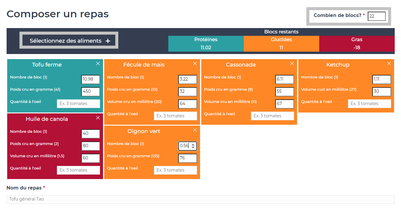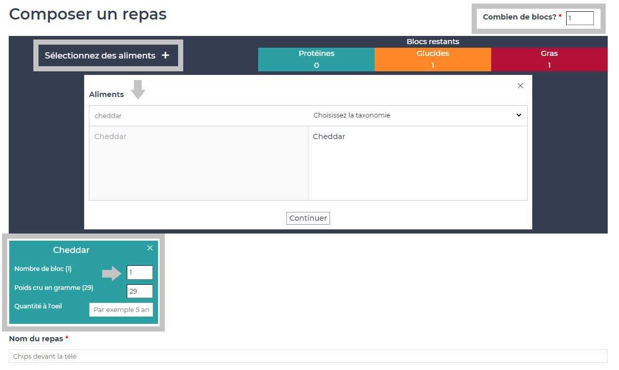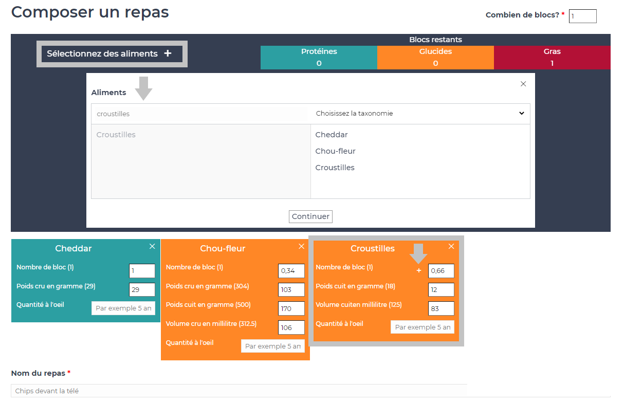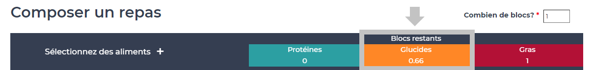 Comme ma collation comporte 1 bloc repas, j’indique la quantité « 1 » dans « Combien de blocs? ».