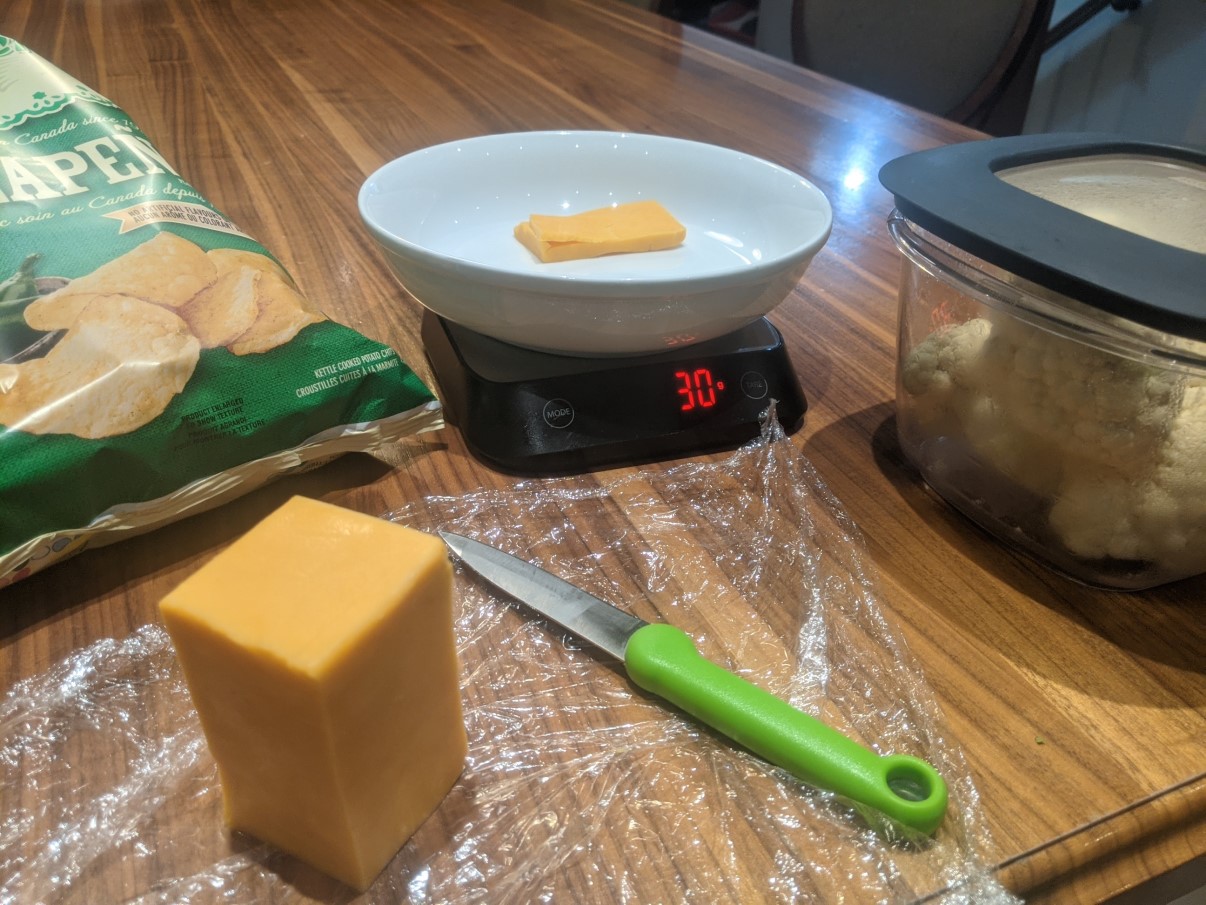 Je place mon bol sur la balance et j’appuie sur « tare ». J’ajoute ensuite du fromage dans mon bol pour arriver à 29 grammes.