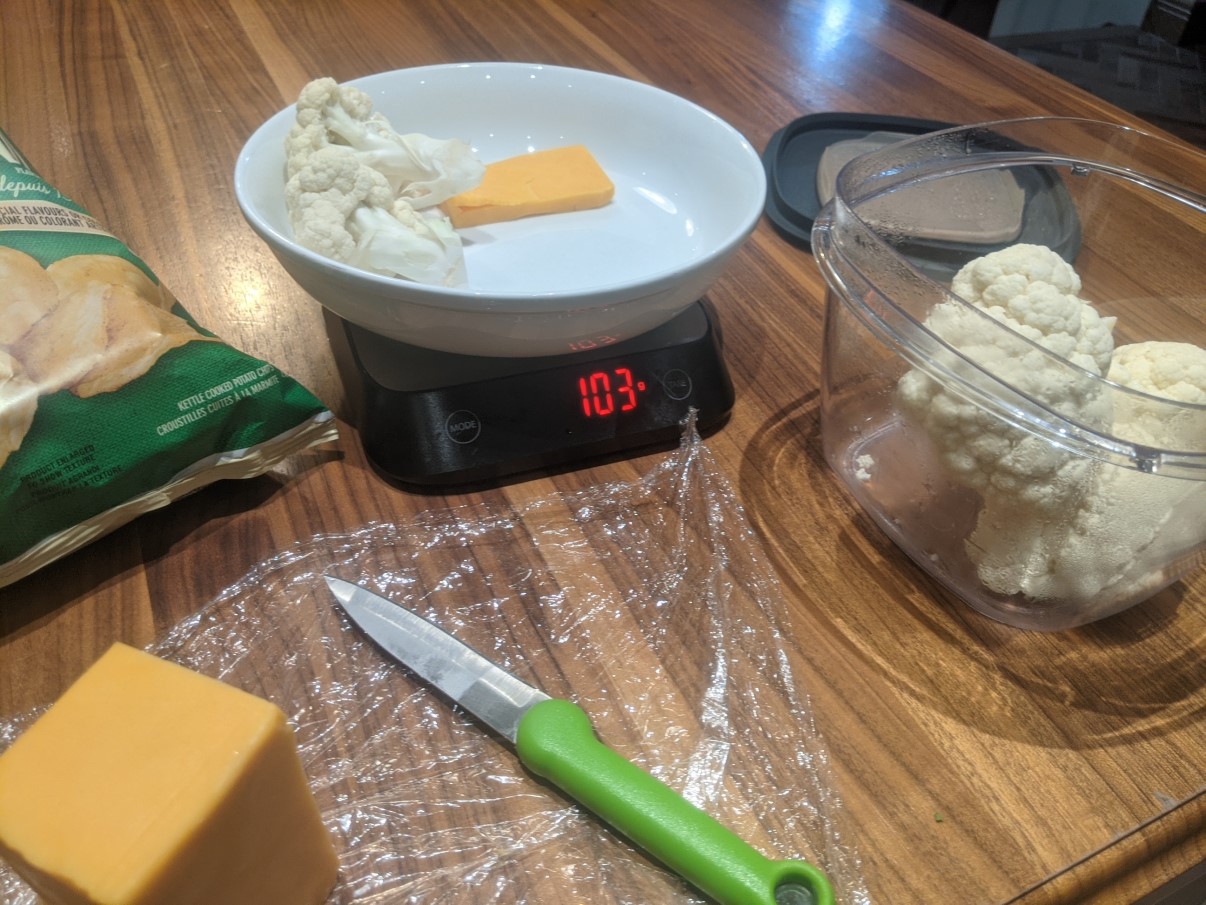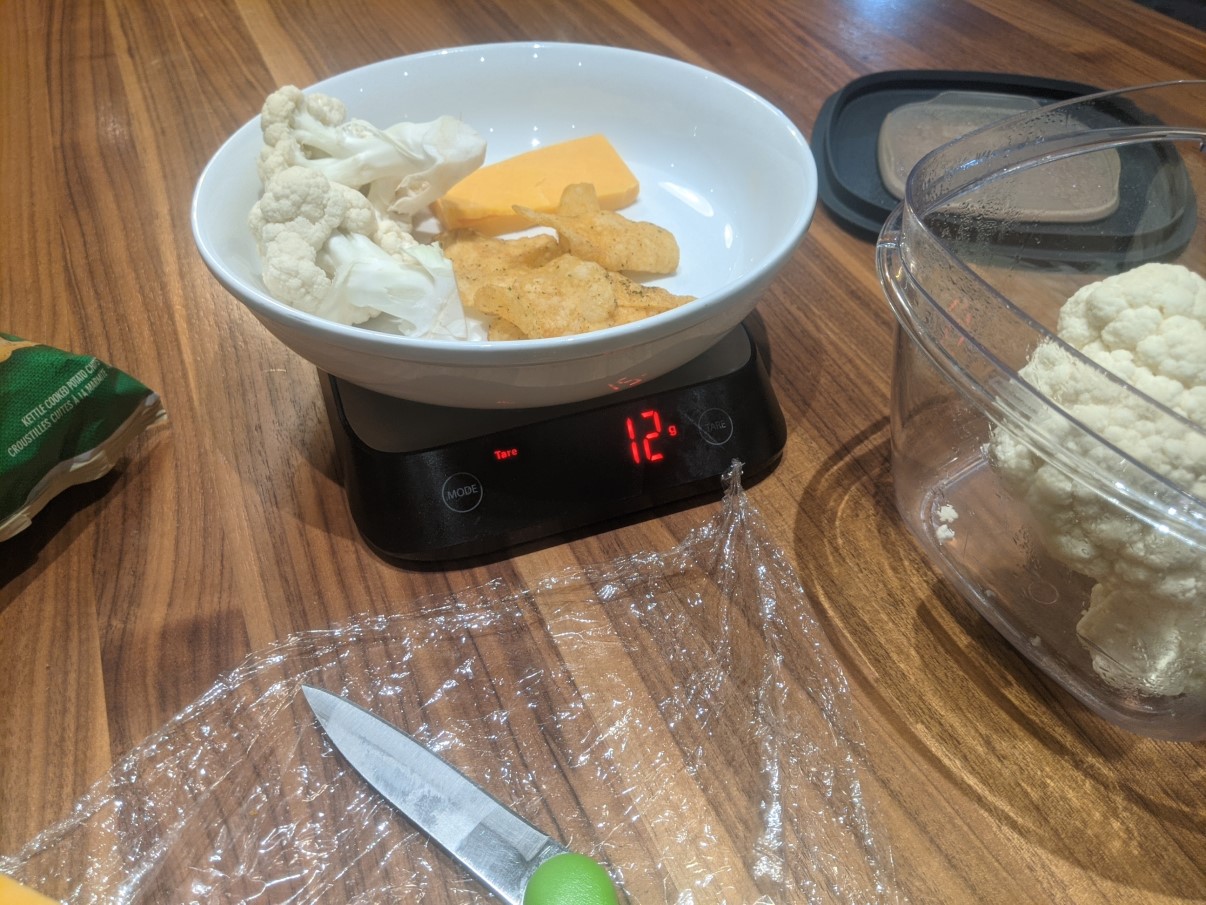 Dans mon exemple, j’ai choisi du chou-fleur. Je ne vais pas manger un bloc de chou-fleur, parce que : c’est beaucoup trop de chou-fleur! Je vais donc peser la quantité de chou-fleur que j’ai envie de manger. J’appuie sur « tare » et j’ajoute du chou-fleur.