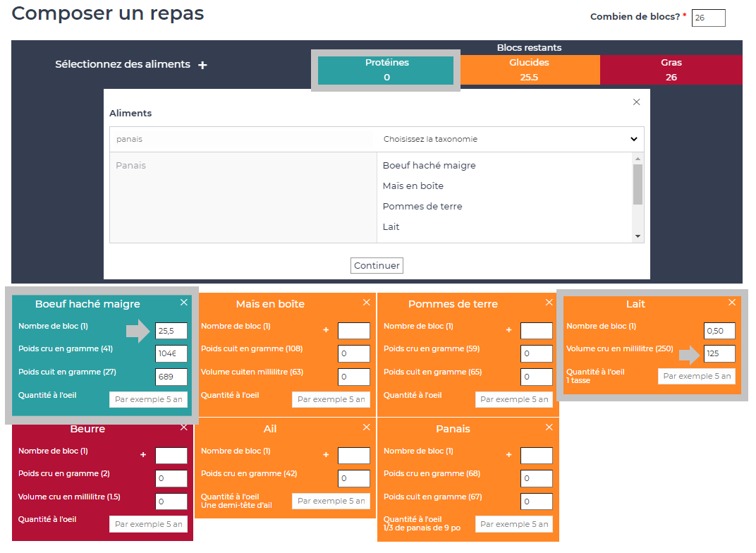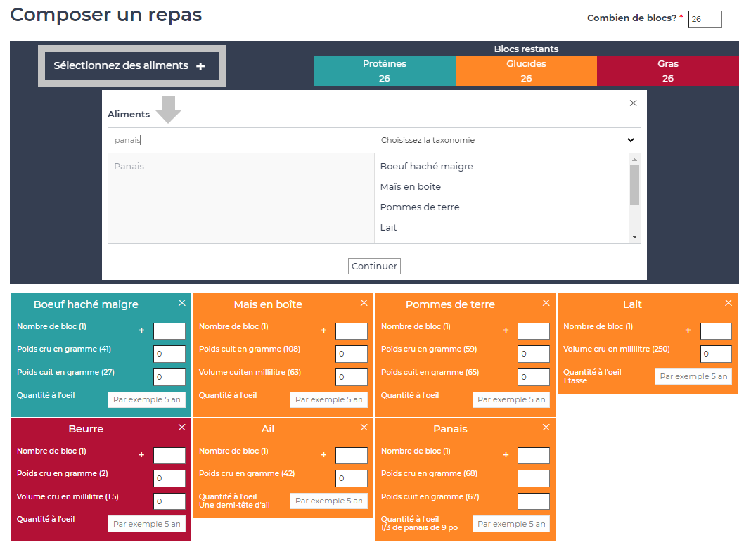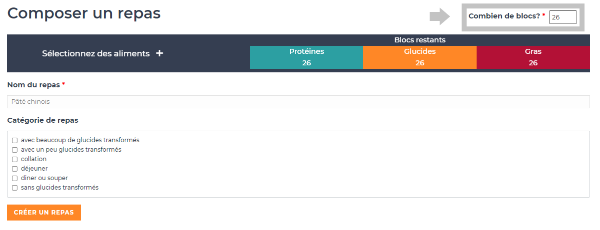 Si on veut avoir des lunchs pour tout le monde, ça donne 26 blocs en tout. Je vais donc indiquer « 26 » dans le nombre de blocs de mon repas.