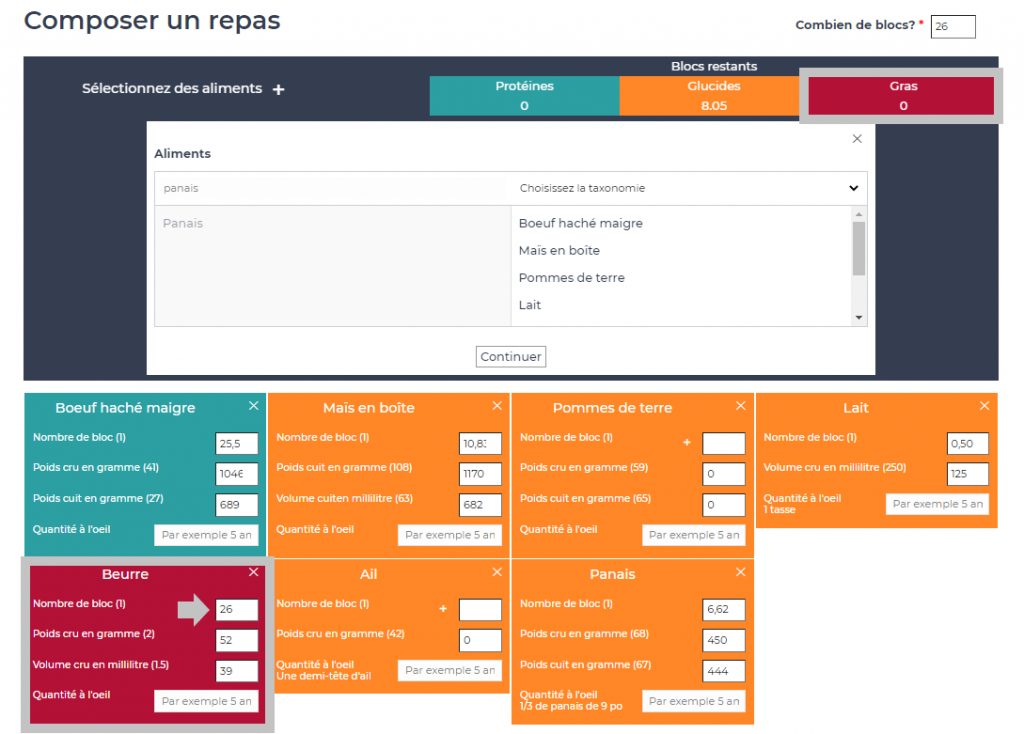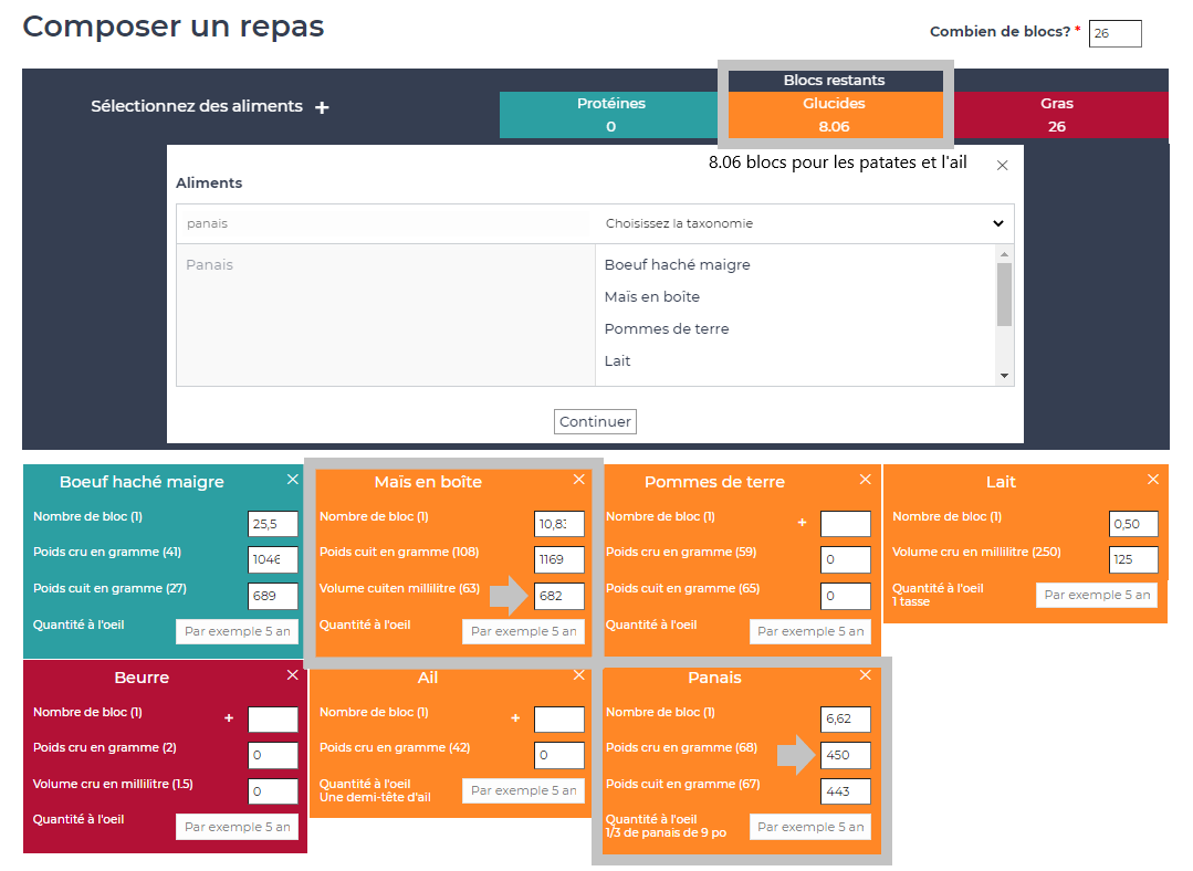 Dans mon exemple, je choisis de manger des croustilles pour mes 0,66 bloc de glucide restant, comme l’indique la boite orange « Glucides».