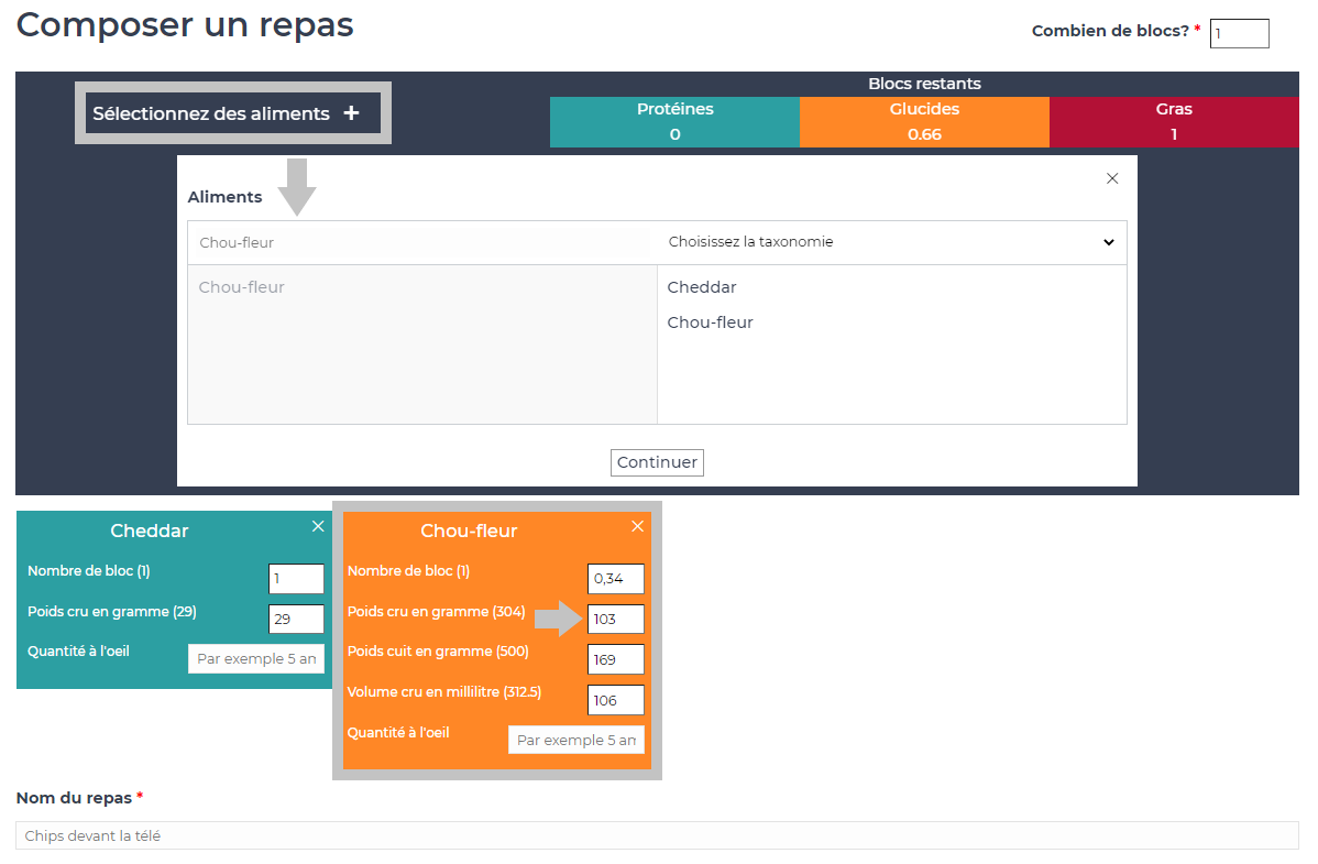 C’est 103 grammes. J’ajoute donc « chou-fleur » à mon repas et j’indique 103 grammes sous « Poids cru en gramme ». Je constate que ça équivaut à 0,34 bloc.