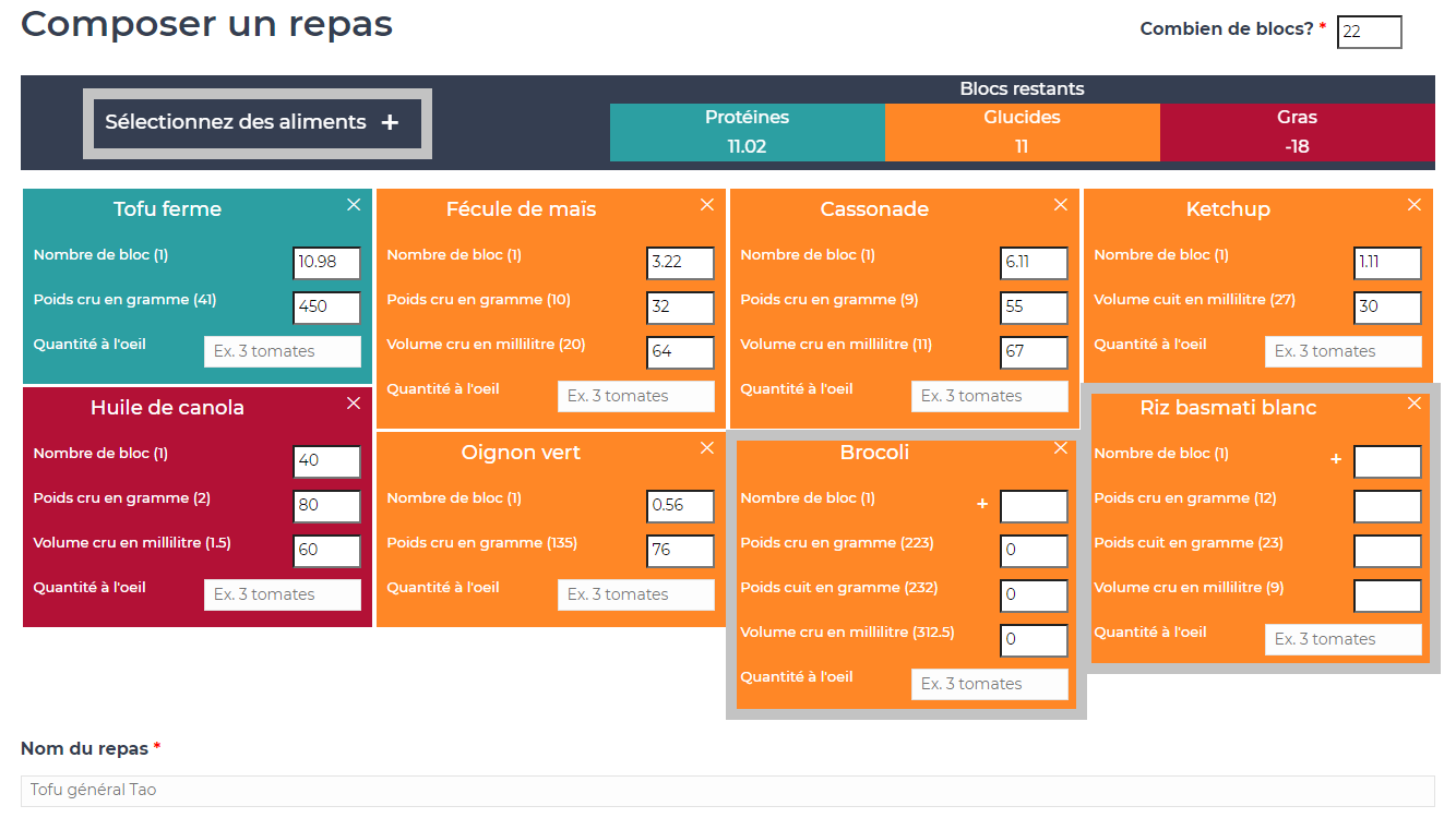 Pour une recette de 22 blocs, il nous reste 10,1 blocs pour le riz et le brocoli. Je vais peser la quantité de brocoli que j’ai et je vais ajouter le nombre de blocs restant pour le riz.