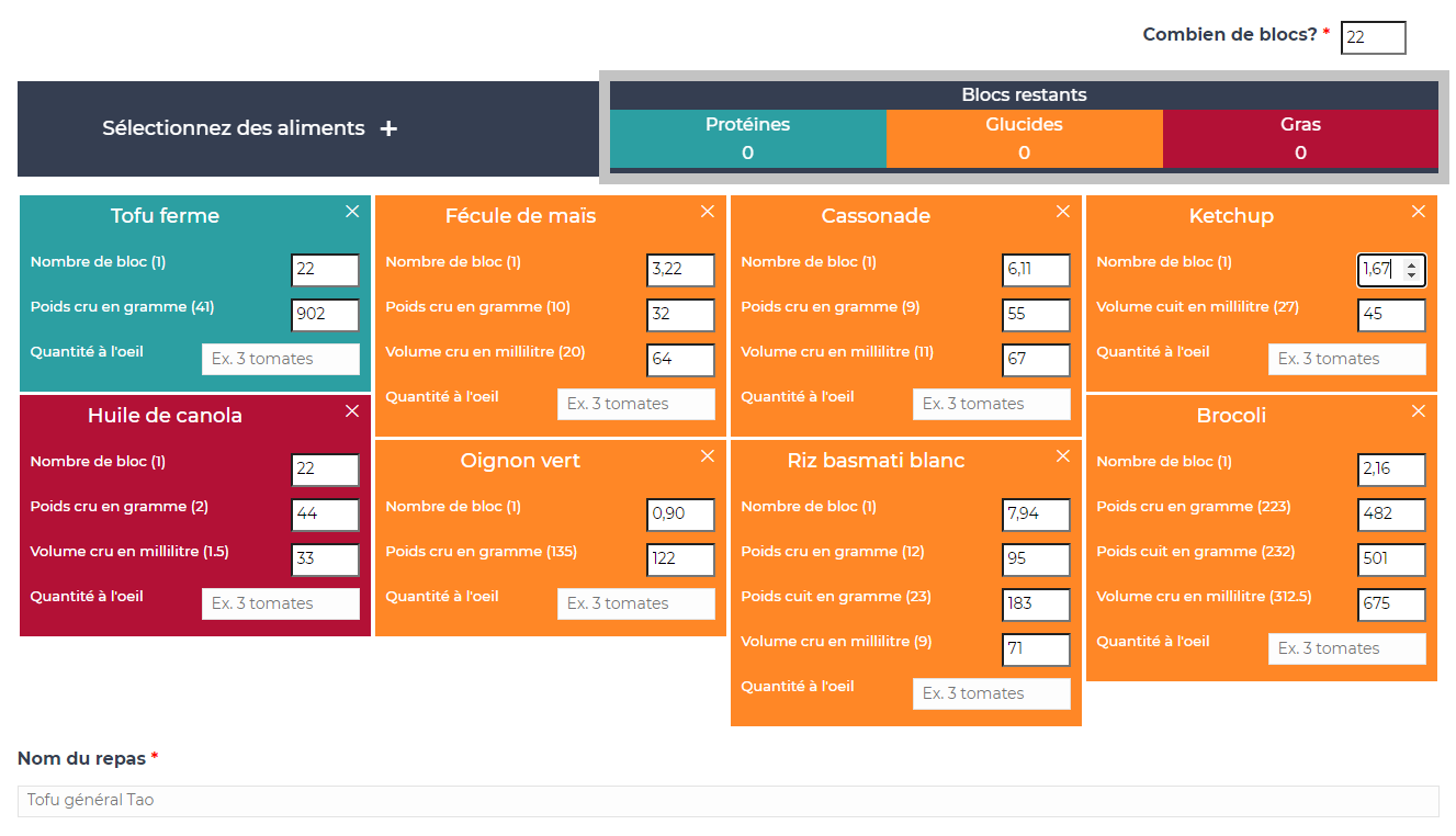 Tu n’es pas obligé d’ajouter les ingrédients « hors calcul » qui ne comptent pas dans les blocs de protéines, de glucides et de gras (herbes, épices, vinaigre, bouillon de poulet, moutarde, sauce soya, etc.)